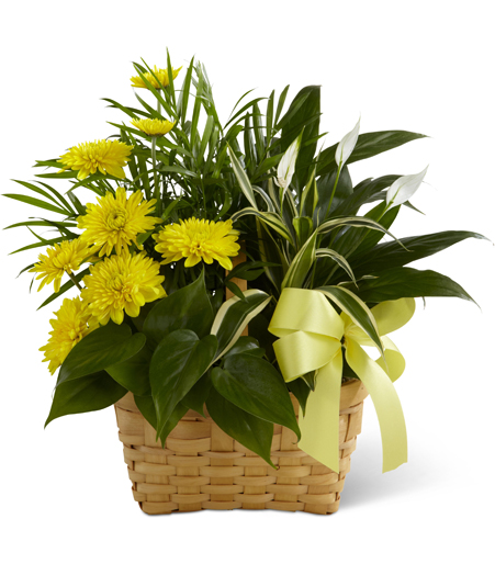 The large, yellow blooms bursting with radiance against the deep green hues of the lush, leathery leaves create a magnificent sight. The rich textures of this dishgarden complement each other perfectly to form a gorgeous mix of floral beauty that expresses your heartfelt emotions.